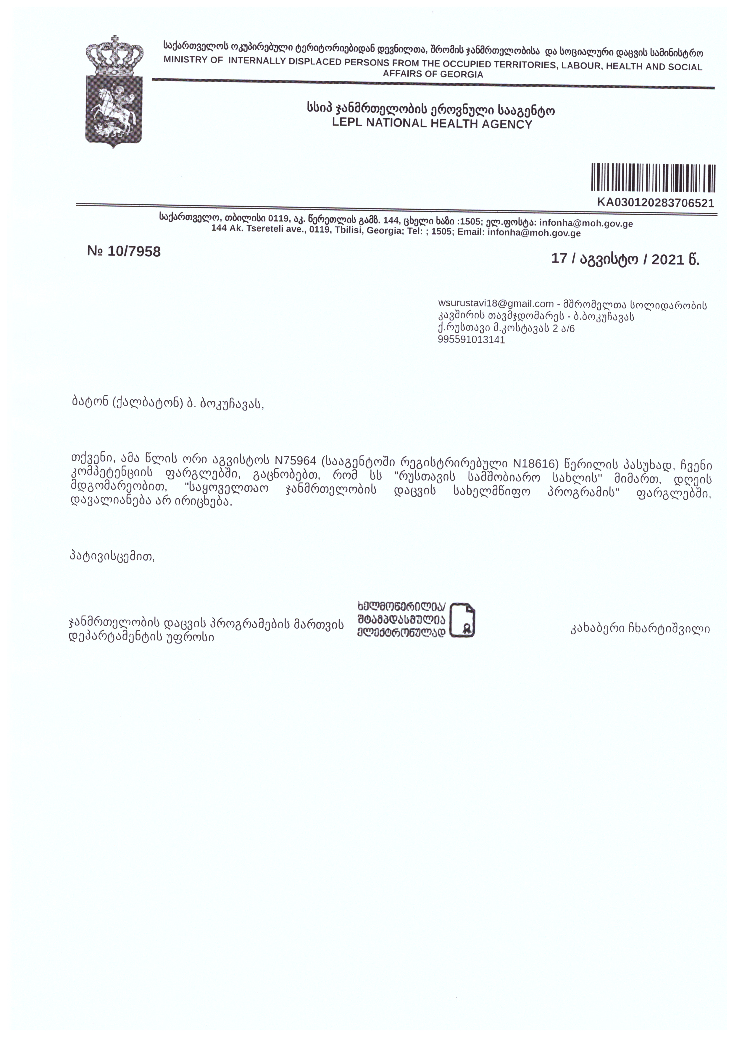 პროფესიულ კავშირთან სოციალური დიალოგის საკითხზე კი ამბობს, რომ არ იცის რა არის ამ დიალოგის მიზანი, როდესაც მათი კომპანია ისედაც მუშაობს ამ საკითხზე. შემოსავლების სამსახურში სამშობიარო სახლის 713 193 ლარიან დავალიანებაზე კი გვპასუხობს: