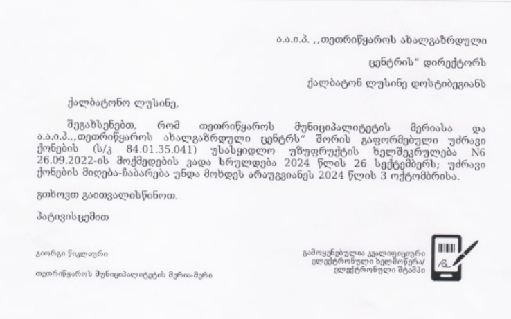 მათი შეთანხმება, შენობის თაობაზე, მერიასთან 2 წელიწადში ერთხელ ხელახლა ფორმდებოდა. თუმცა, მიმდინარე წლის 5 ივლისს, მუნიციპალიტეტის მერის ხელმოწერით, ორგანიზაციამ მიიღო წერილი, რომ ხელშეკრულების ვადის გასვლის შემდეგ, ახალგაზრდულმა ცენტრმა შენობა მიმდინარე წლის 3 ოქტომბრამდე უნდა დატოვოს.
